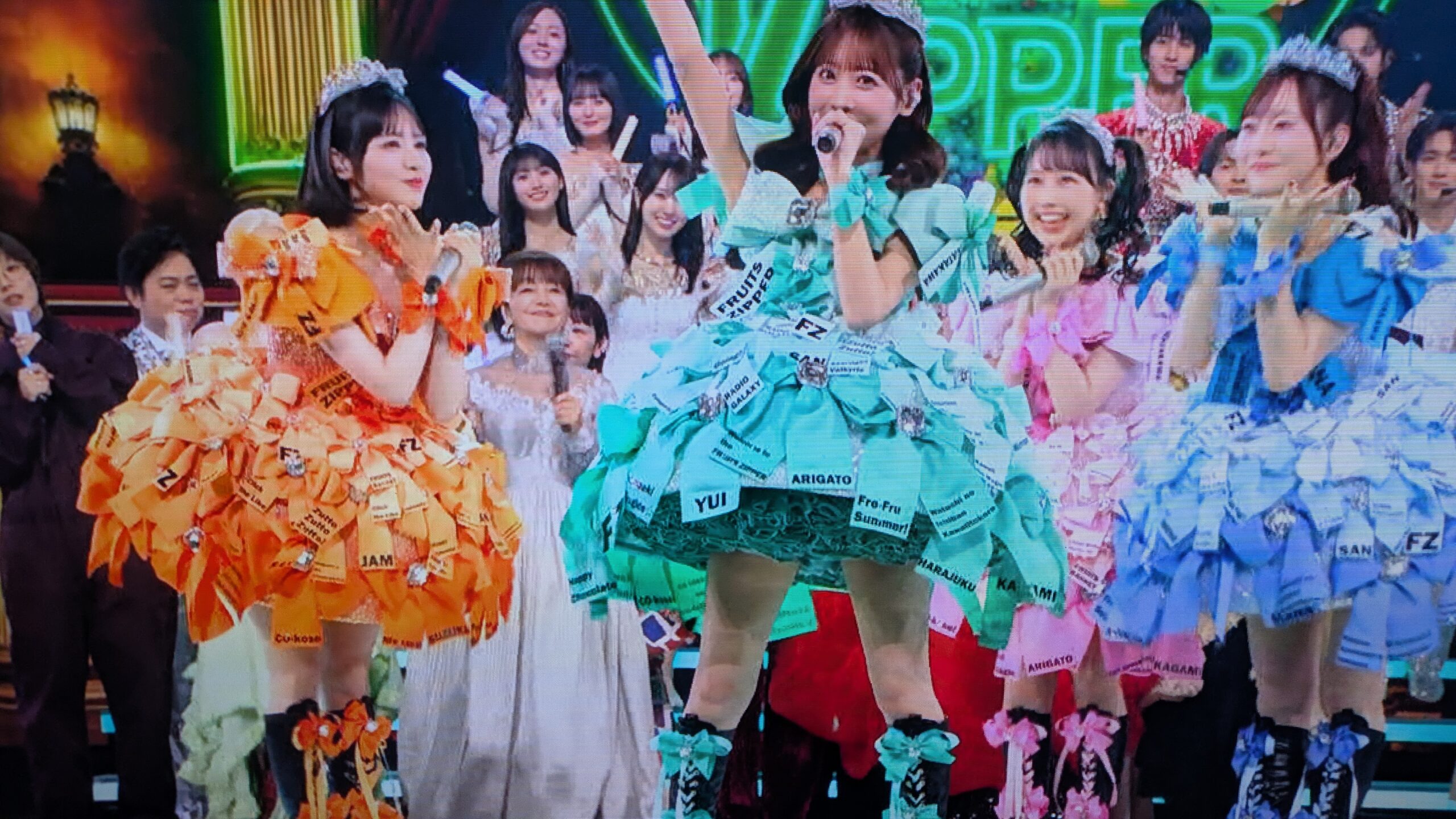 フルーツジッパーが着用していた衣装は、たくさんのリボンがあしらわれていたデザインで、そのリボン一つひとつに文字が書かれていました!
